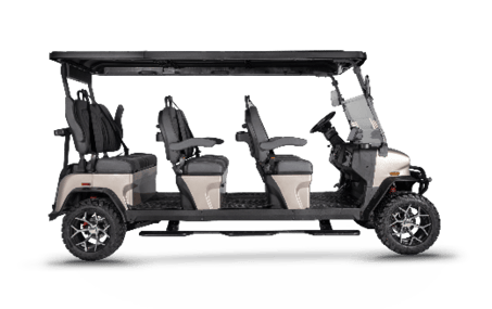 Electric golf cart with an extended seating layout for short-distance transport across golf courses, resorts, and large private properties