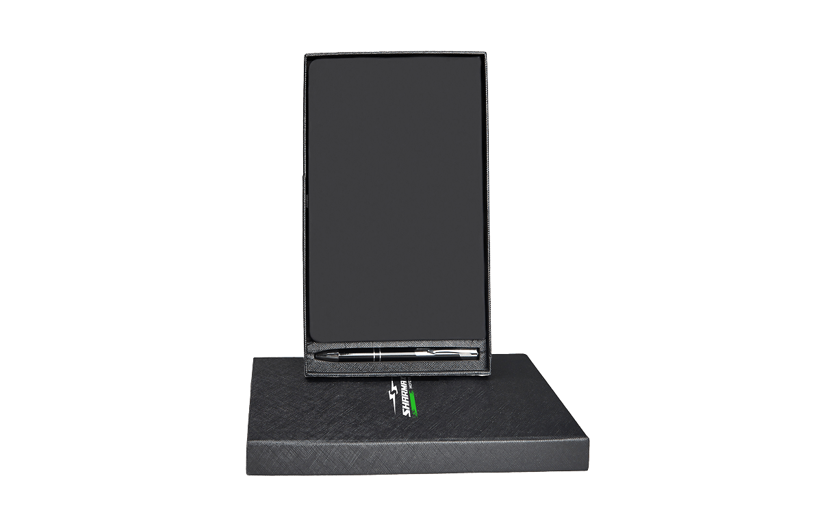 A professional matte-finish notebook with a soft-touch cover and Sharmax-branded ballpoint pen. Ideal for meetings, planning, or jotting down ideas on the go. Compact, stylish, and always ready when inspiration strikes.