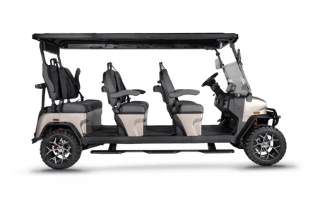 Carrinho de golfe elétrico com configuração ampliada de assentos, ideal para transporte de curta distância em campos de golfe, resorts e grandes propriedades privadas