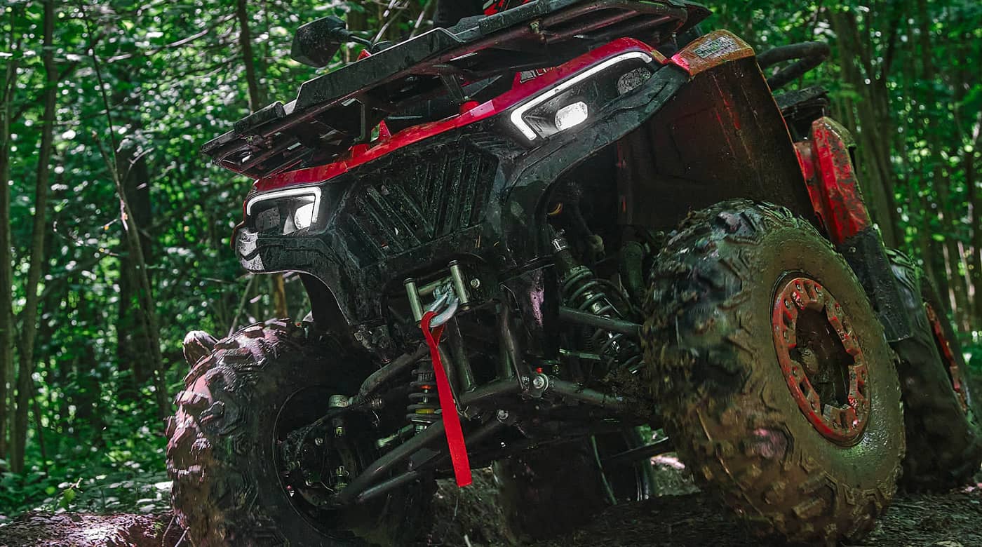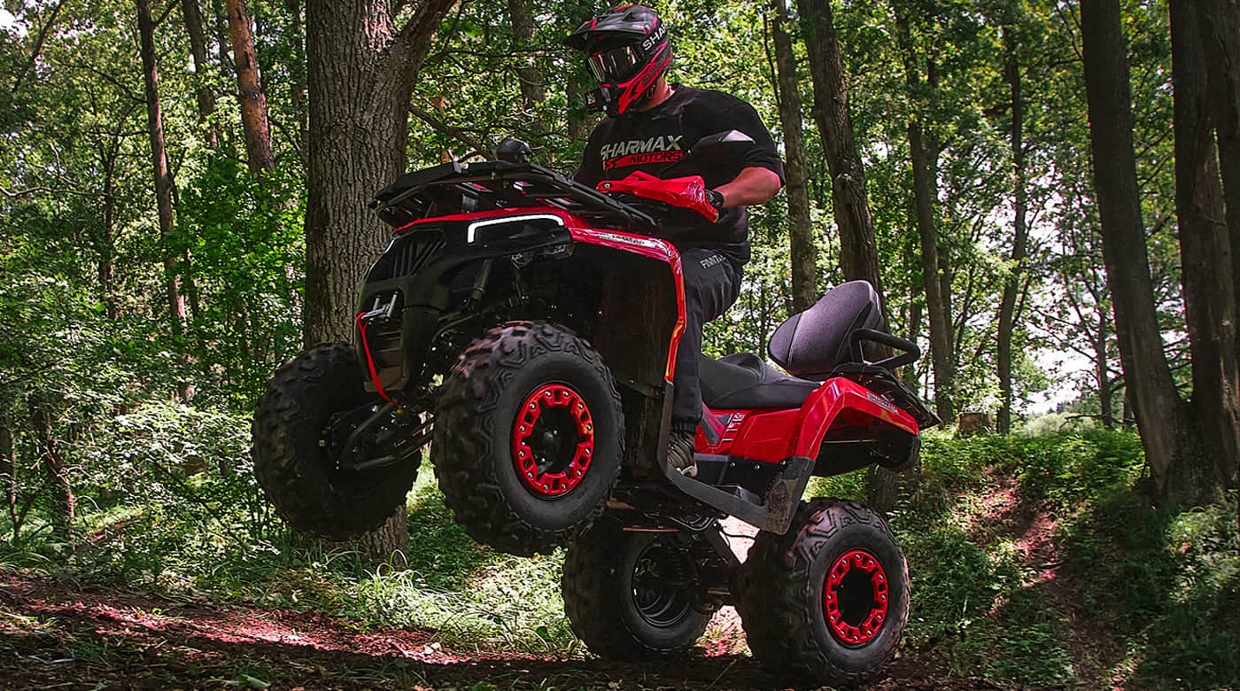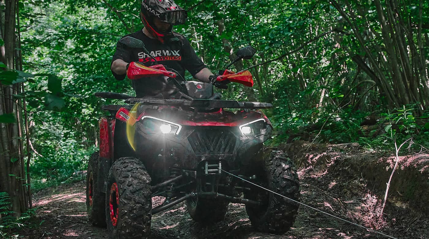На версиях Sharmax Hummer 320 RX в комплектации с лебедкой она становится настоящей «страховкой» на бездорожье: электрическая лебёдка помогает вытянуть квадроцикл из глубокой колеи, грязи или снега, а также подтянуть прицеп, лодку или сани на крутой подъем. Владельцы используют лебедку не только для самоспасения, но и как рабочий инструмент — чтобы аккуратно вытянуть технику друзей, вытащить застрявший груз или подтянуть квадроцикл при погрузке на прицеп. Подвеска у Sharmax Hummer 320 RX изначально создана под суровое бездорожье: спереди стоит независимая подвеска на двойных А‑образных рычагах, сзади — маятниковая, а в качестве элементов используются три газомасляных амортизатора с регулировкой жесткости и преднатяга. Такой набор обеспечивает ход подвески порядка 150 мм спереди и до 180–190 мм сзади и клиренс 300 мм, благодаря чему квадроцикл мягко отрабатывает кочки и корни, не пробивается на трамплинах.