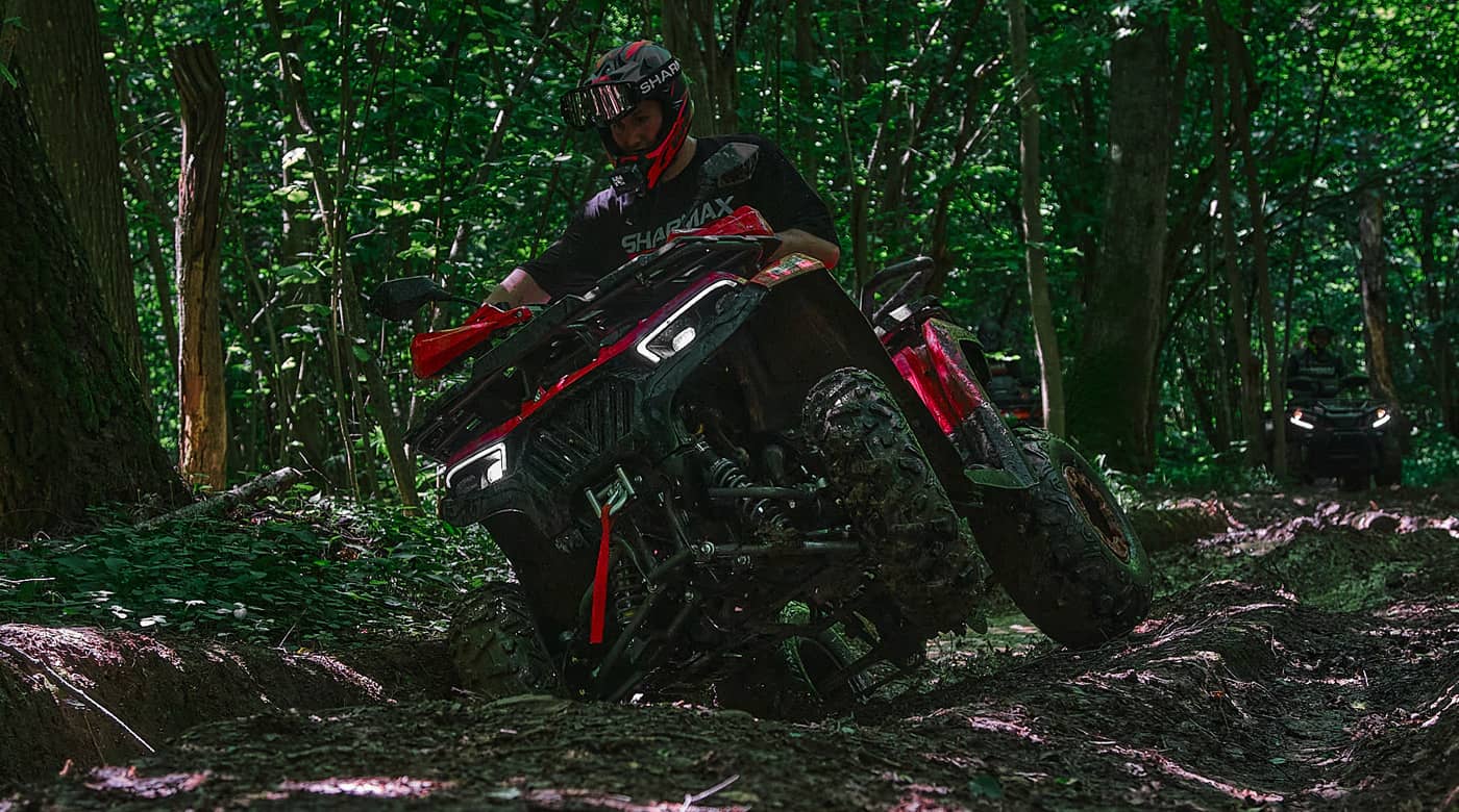 развесовки квадроцикл не заваливается на бок, лучше держит траекторию на уклонах и не боится резких смен рельефа. При этом спарка тяговитого 4‑тактного мотора с надежной вариаторной трансмиссией обеспечивает ровную тягу с самых низких оборотов, поэтому Sharmax Hummer 320 RX уверенно ползет по грязи, мокрой траве и песку, не теряя сцепления. Зубастая внедорожная резина и широкая колесная база добавляют сцепления и устойчивости: квадроцикл «вгрызается» в грунт, реже пробуксовывает и легче выбирается из колеи и глубоких луж, что подтверждают тесты проходимости в лесу, поле и на песке.