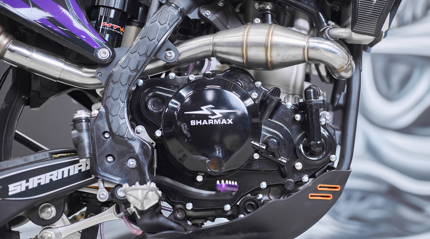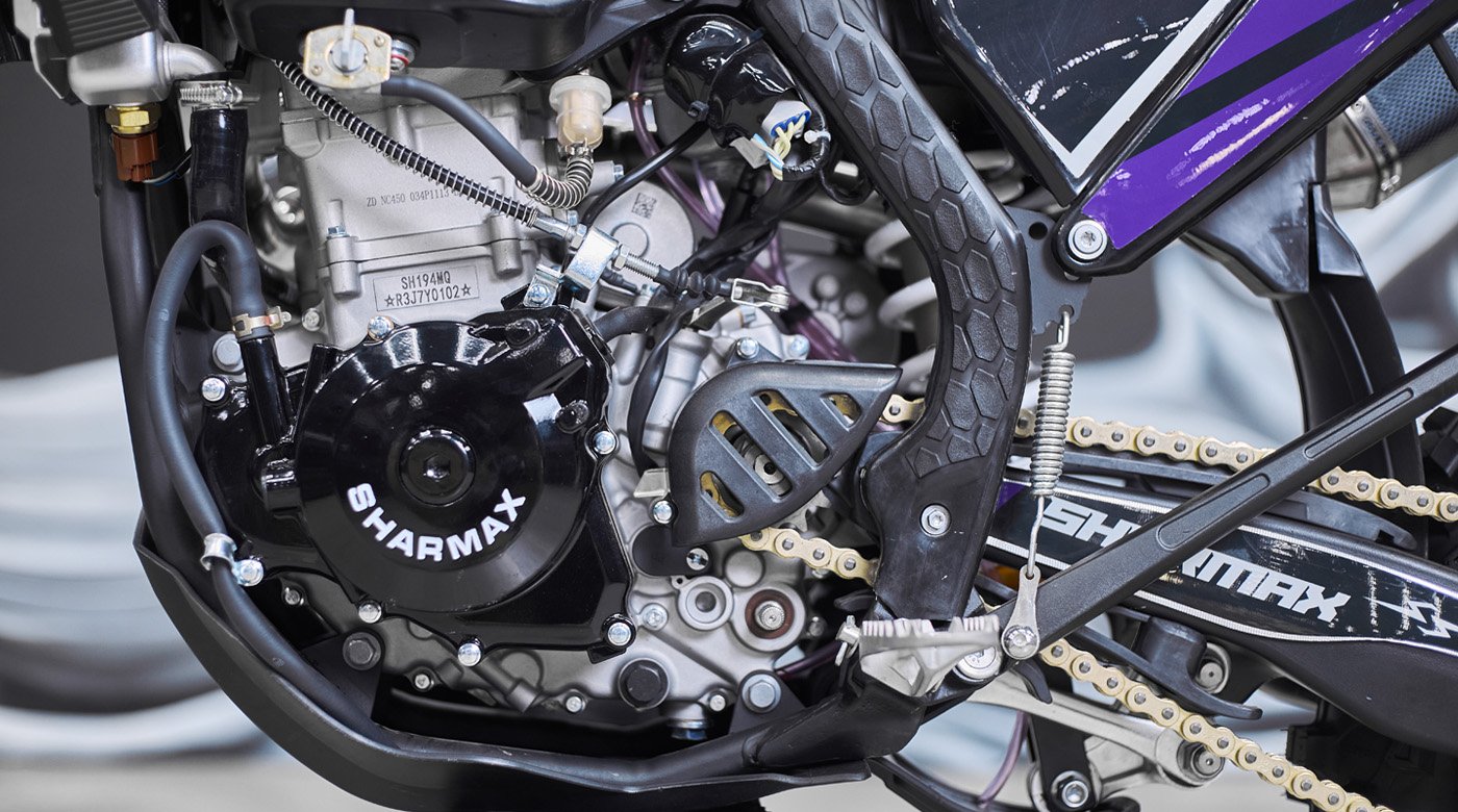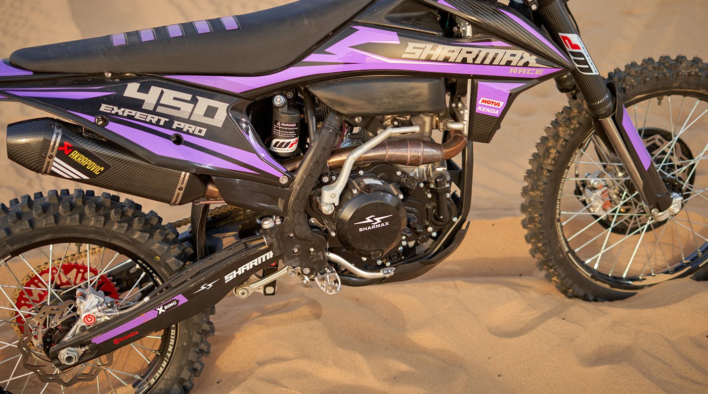Такая эргономика даёт надёжный контроль над передком: байк уверенно слушается команд, не требует чрезмерных усилий на руле и позволяет точно чувствовать, что происходит под колесами. Sharmax Expert Pro RXP 450 позволяет ехать агрессивно, не превращая управление в борьбу с мотоциклом — при условии, что пилот физически подготовлен.